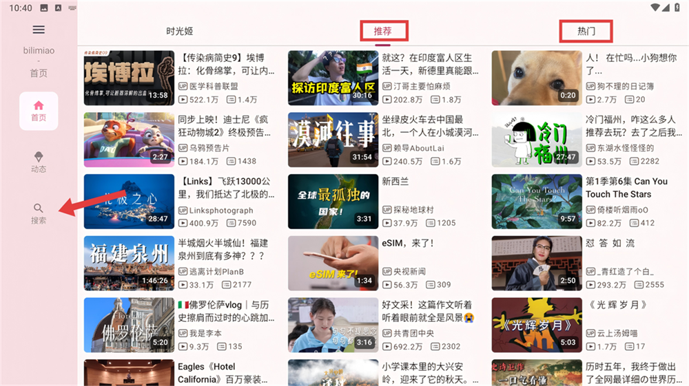 1、瞧见左侧的【搜索】按钮,点它就能查找内容啦,首页还有【推荐】、【热门】等板块,方便随意逛逛。