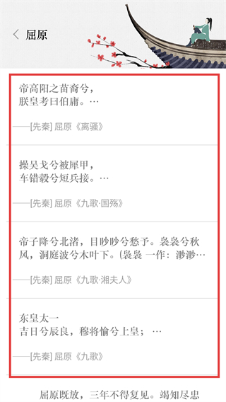 4、点击【屈原】后,页面会展示其作品列表,包含【離騷】【九歌·國殤】等多篇经典作品,可查看具体内容。