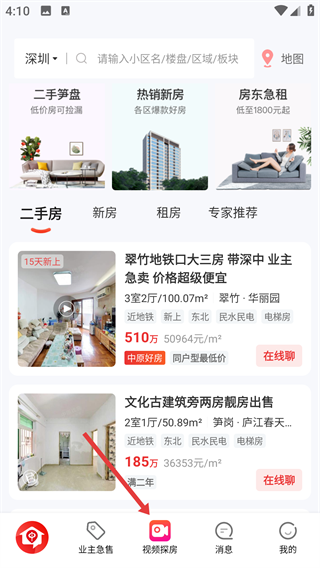 1、我们点击底部【视频探房】,进入房源视频浏览界面呢。