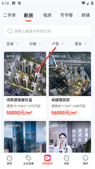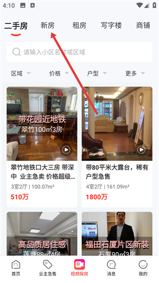 2、在界面上方点击【新房】标签,切换到新房房源列表,方便筛选新房源呀。