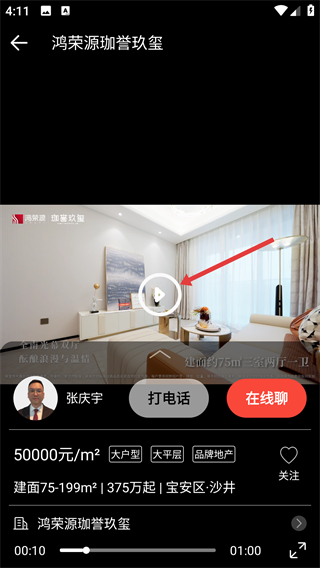 4、在房源详情页,点击播放按钮就能查看房源视频信息,还可联系经纪人了解更多啦。