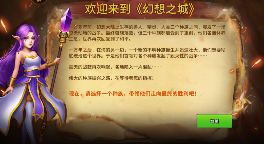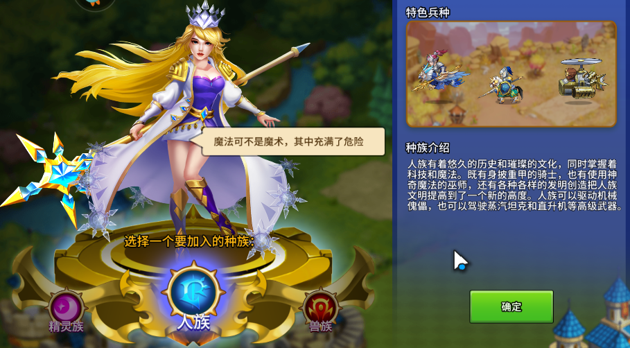 1、下载并安装好幻想之城游戏,进入游戏界面,选择要加入的一个种族,点击“确定”