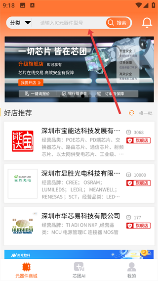 2、在元器件商城页面,点击顶部搜索框,输入目标型号后,点击【搜索】按钮。
