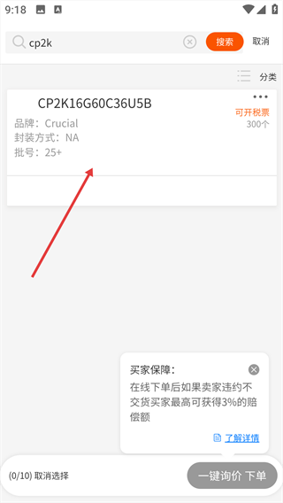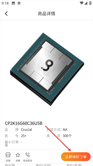 4、进入商品详情页后,点击底部的【立即询价下单】按钮,发起该元器件的采购流程。