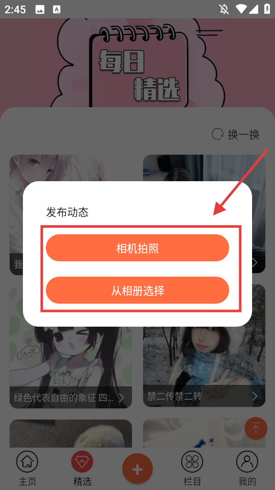 1、点击底部橙色加号按钮,弹出发布动态选项。