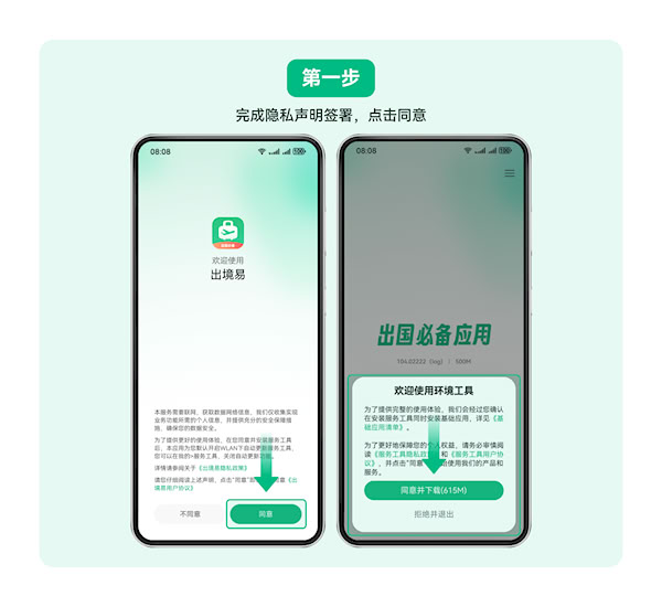a.首次打开出境易应用时会弹出《出境易隐私政策》和《出境易用户协议》界面,点击同意