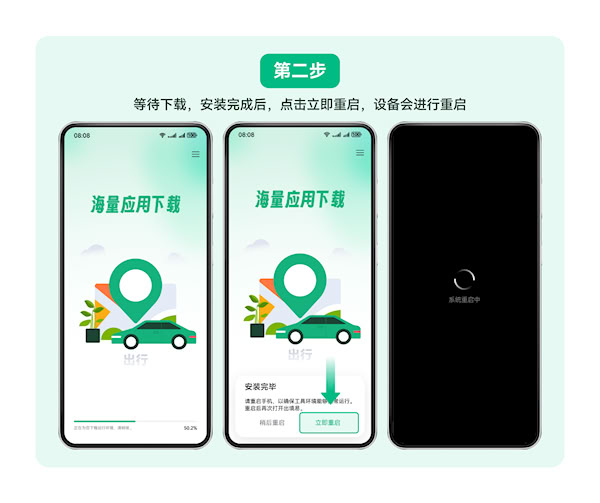 2.在下载界面,等待下载并安装完成后,点击立即重启按钮,设备会进行重启