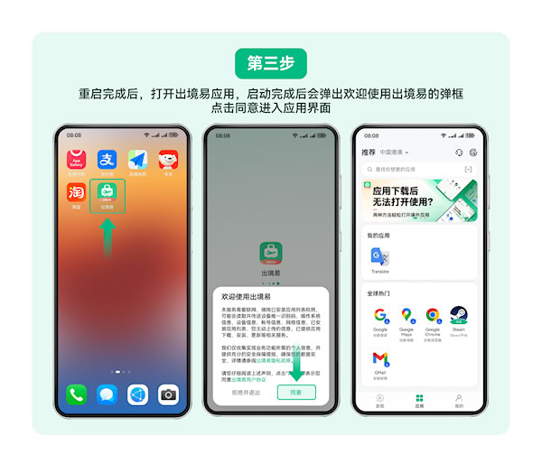 3.重启完成后,打开出境易应用,启动完成后会弹出欢迎使用出境易的弹框,点击同意进入应用界面。