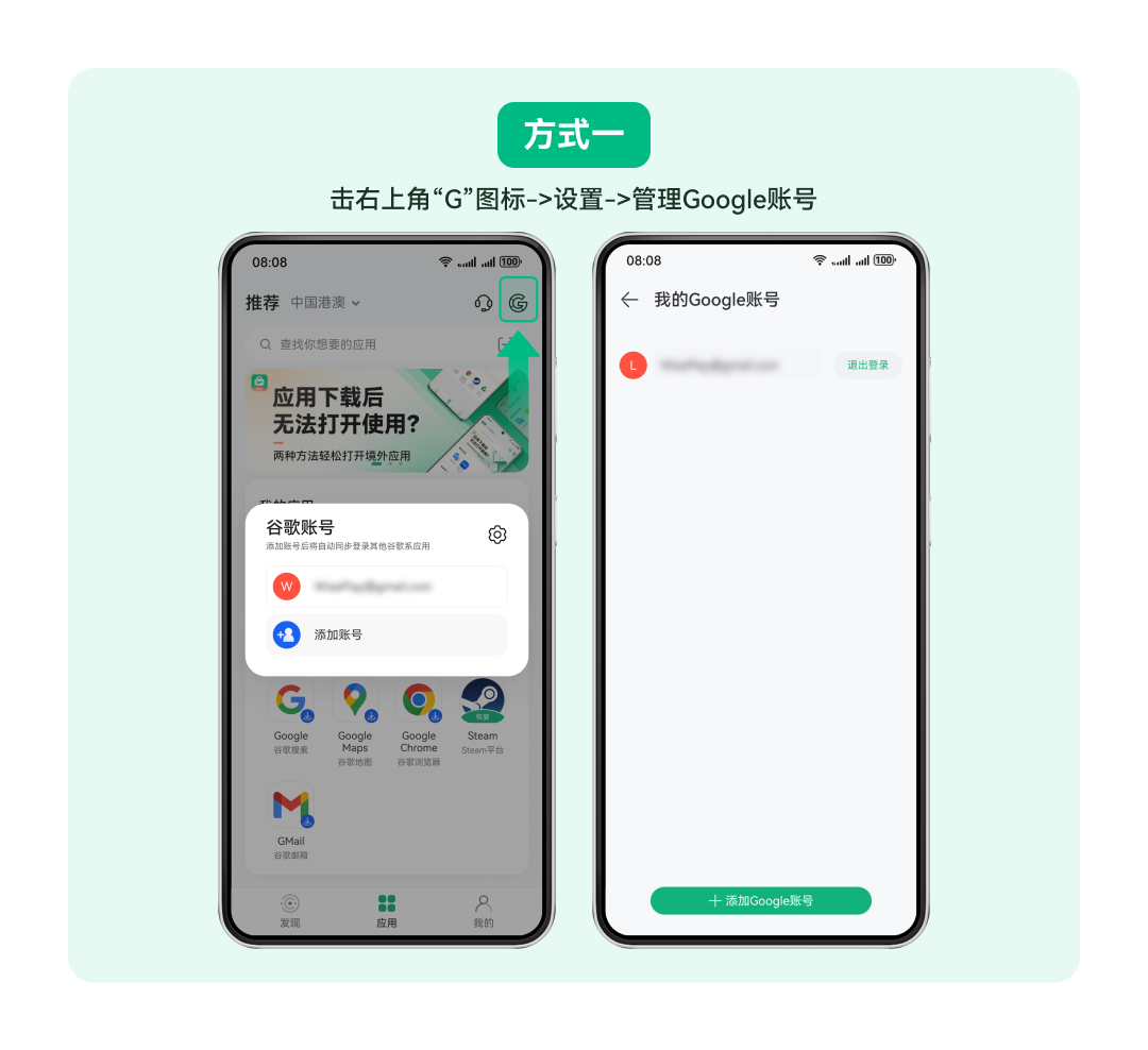 1.打开出境易应用,在应用界面,点击右上角的G图标进行Google账号管理。