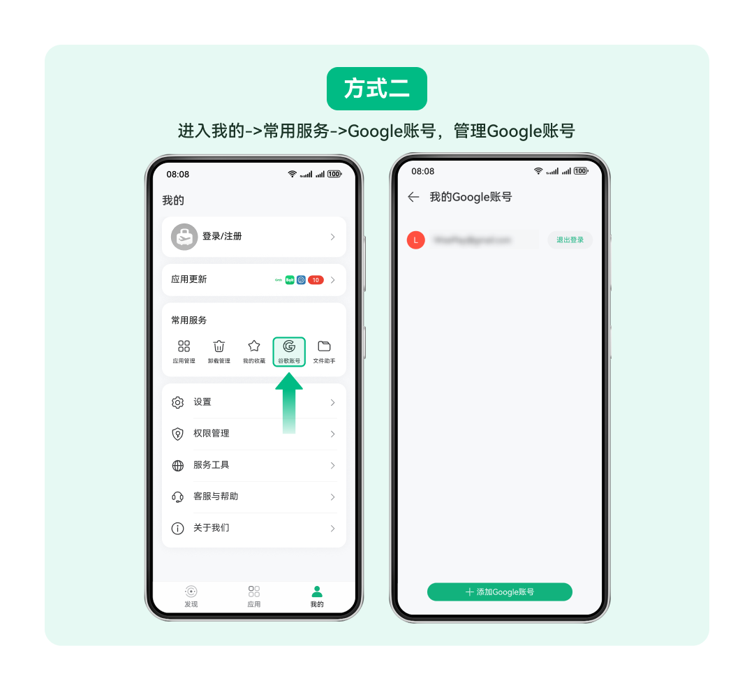 2.打开出境易应用,进入我的->常用服务->Google账号,可以管理自己的Google账号。
