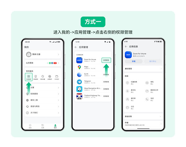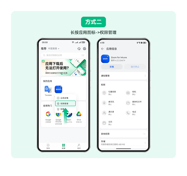 您可通过出境易内应用管理,查看已安装应用列表,管理应用的通知、权限及存储。