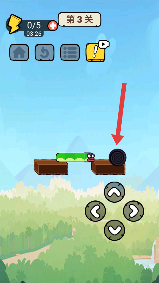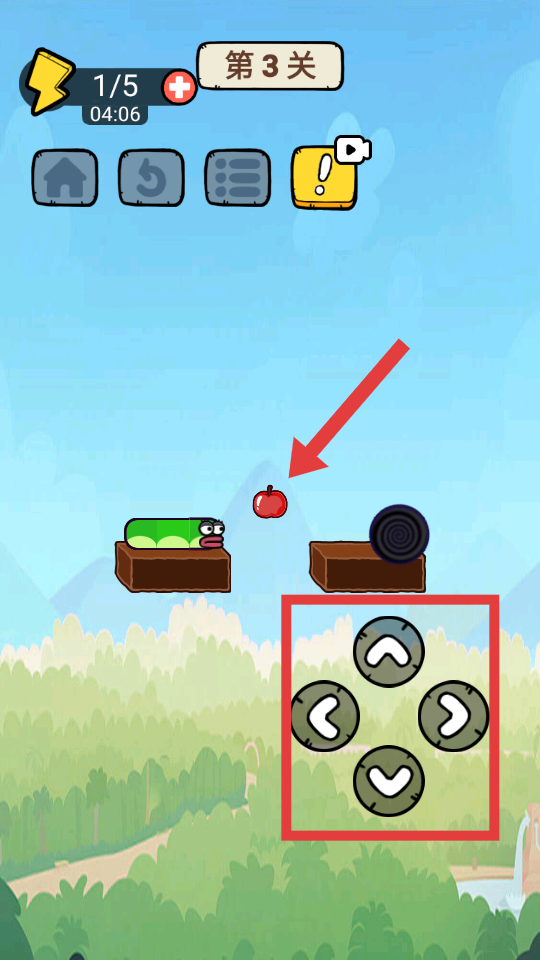 2、进入关卡后,利用屏幕右下【红框】内方向按钮,操控苹果蛇去吃画面中的【苹果】。