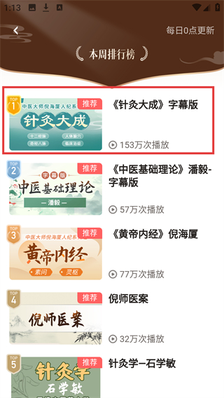 3、在课程排行榜中,找到【《针灸大成》字幕版】课程,点击可进入课程页。