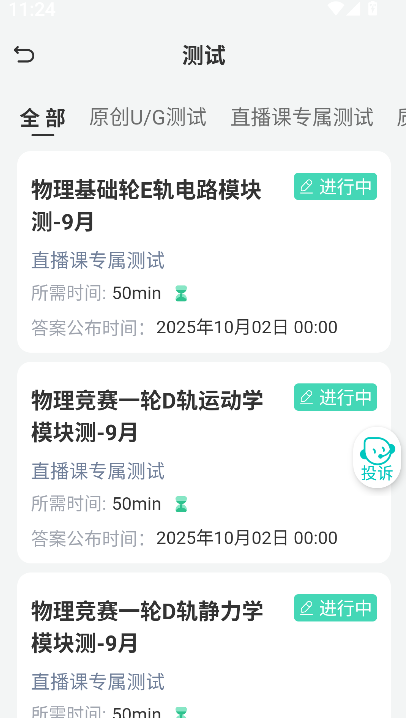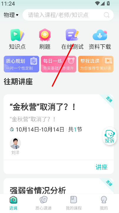 1、进入软件首页后,点击“在线测试”功能入口,即可进入测试页面,查看系统提供的各类考试模块。