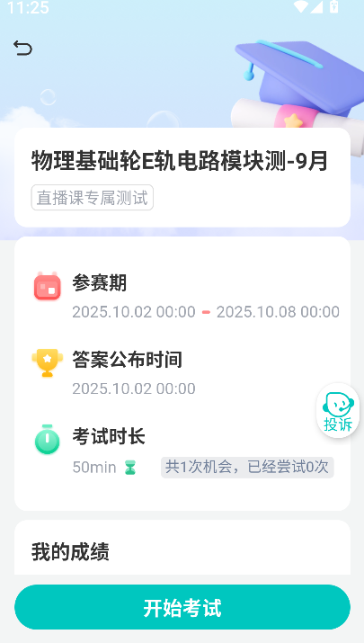 3、确认课程后点击“开始考试”,即可进入答题界面,完成整套试题,系统会自动保存并生成测试结果。