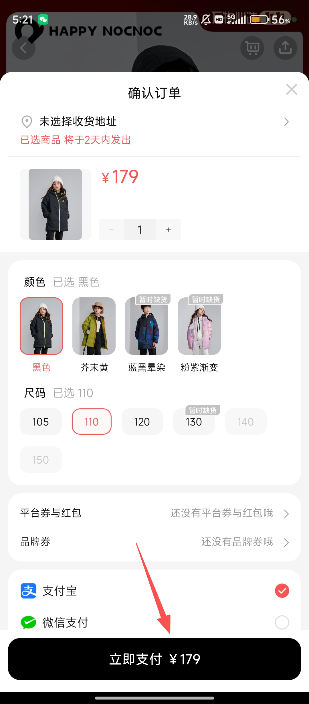 4、在确认订单页面,选好颜色、尺码和支付方式,点击【立即支付】,就能完成购买啦。