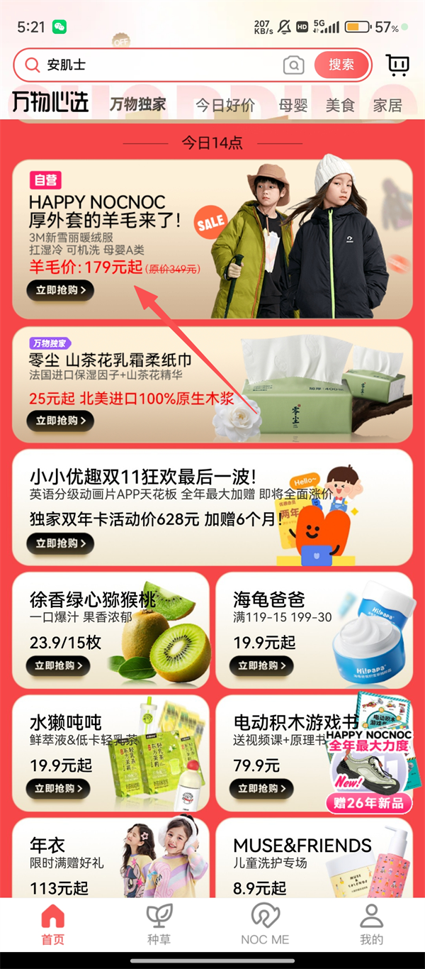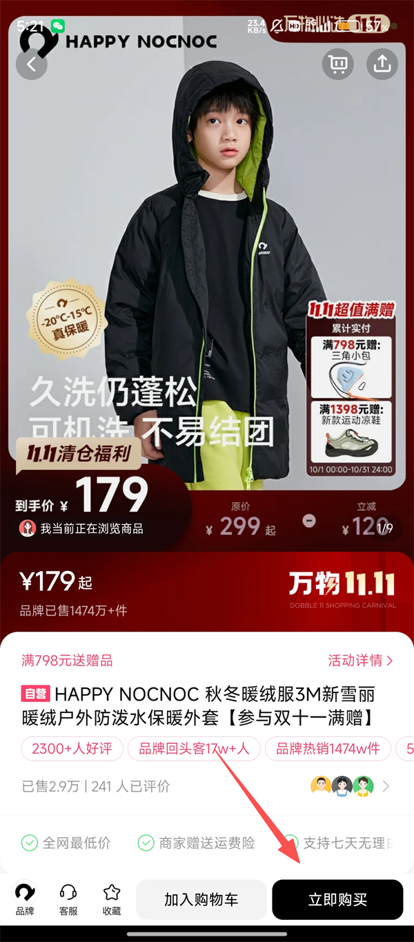 1、我们打开万物心选,在首页挑选心仪商品,比如【HAPPY-NOCNOC厚外套】,点击即可进入商品详情页哦。