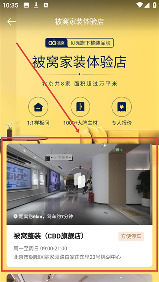 2、进入装修页面后,点击【找门店】选项,切换至被窝家装体验店列表,可查看相关门店信息。