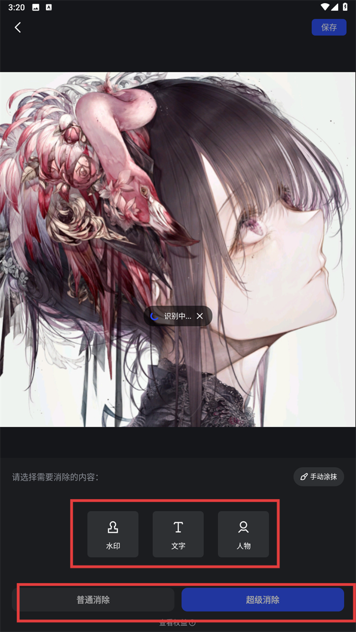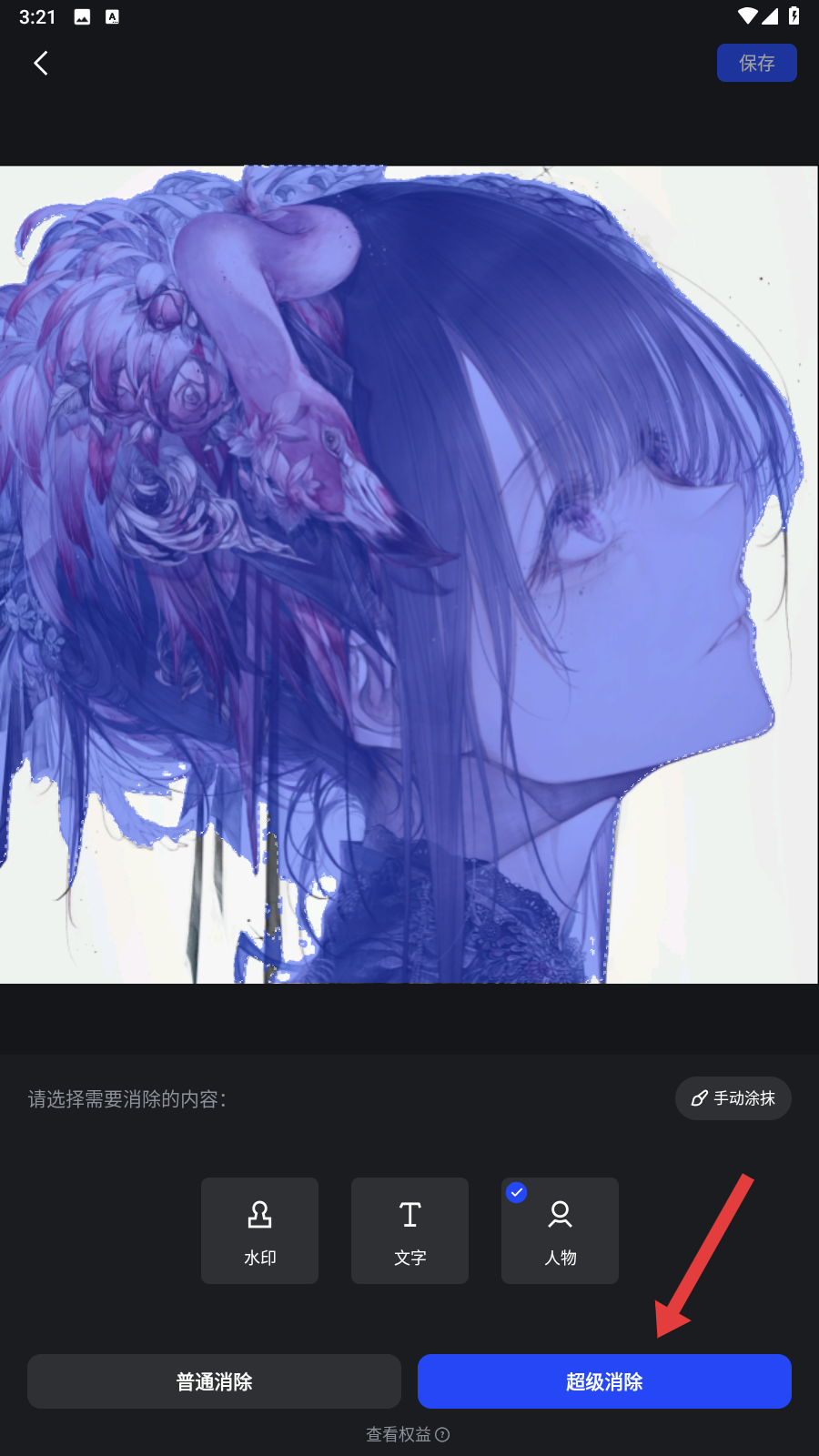 4、选好消除类型和模式后,点击【超级消除】,待处理完成后保存,就能得到无水印的图片啦。