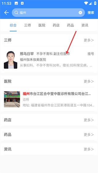 3、在搜索结果中,选择目标医生,点击进入该医生的主页。