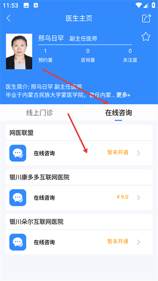 4、在医生主页切换至“在线咨询”标签页,点击进行咨询。