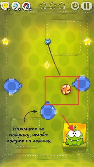 3、待糖果被气泡托举后,切断悬挂糖果的绳子,让糖果顺着气泡的支撑向小怪兽方向移动。