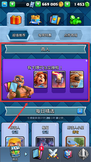 1、在【商人】界面可交换卡牌,关注【每日精选】及刷新倒计时,积累资源提升卡牌等级增强战力。