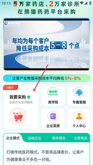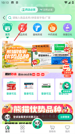 1、进入熊猫药药首页,点击【我要采购】选项。