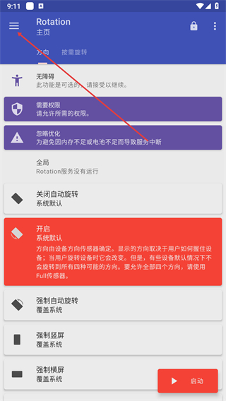 1、打开Rotation首页,点击菜单图标,展开功能列表。