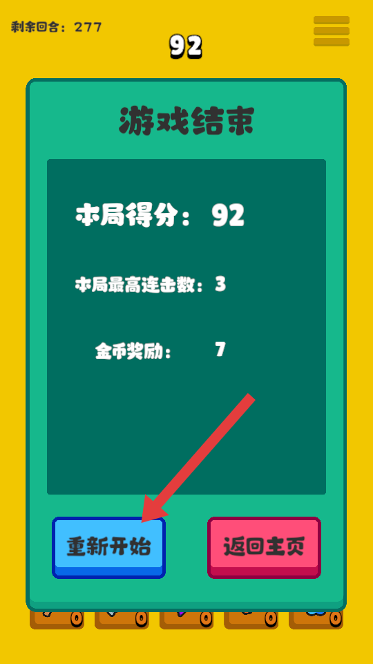 4、当没有可合并的方块,出现【游戏结束】提示后,查看得分等信息,可点击【重新开始】按钮开启新一局游戏。