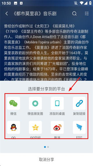 4、在分享平台选择页面,选择要分享的平台(如微信、微信朋友圈等),完成内容分享操作。