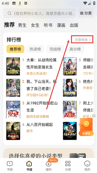 1、在【书城】页面,点击【排行榜】旁的【完整榜单】,即可进入得间排行榜的综合榜单界面。