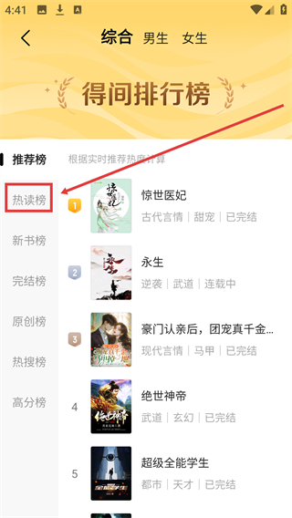 2、进入【得间排行榜】页面后,选择左侧【热读榜】选项,即可查看热读榜下的小说列表。