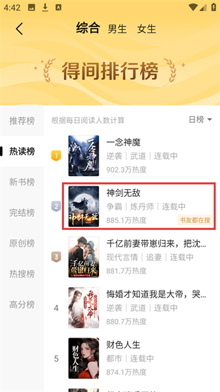 3、在【热读榜】列表中,选择【神剑无敌】小说并点击,即可进入该小说的阅读界面。