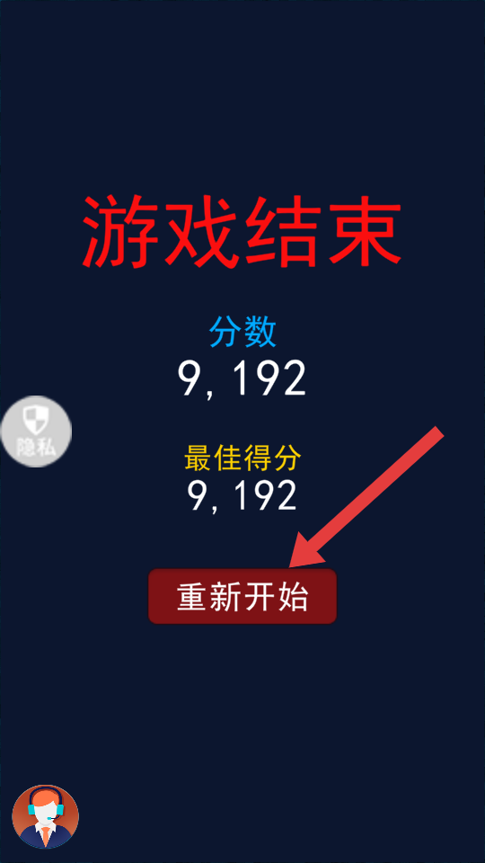 4、当方块堆积超过界限游戏结束,查看【分数-9,192】,点击【重新开始】按钮,开启新一局挑战。