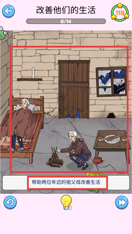 1、进入【改善他们的生活】关卡,明确任务是【帮助两位年迈的祖父母改善生活】,将钞票拖动至方框内进行。