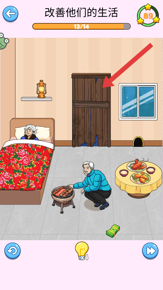 2、将屋内设施全部改善完成后,推进任务进度到【13/14】,最后点击【门】。
