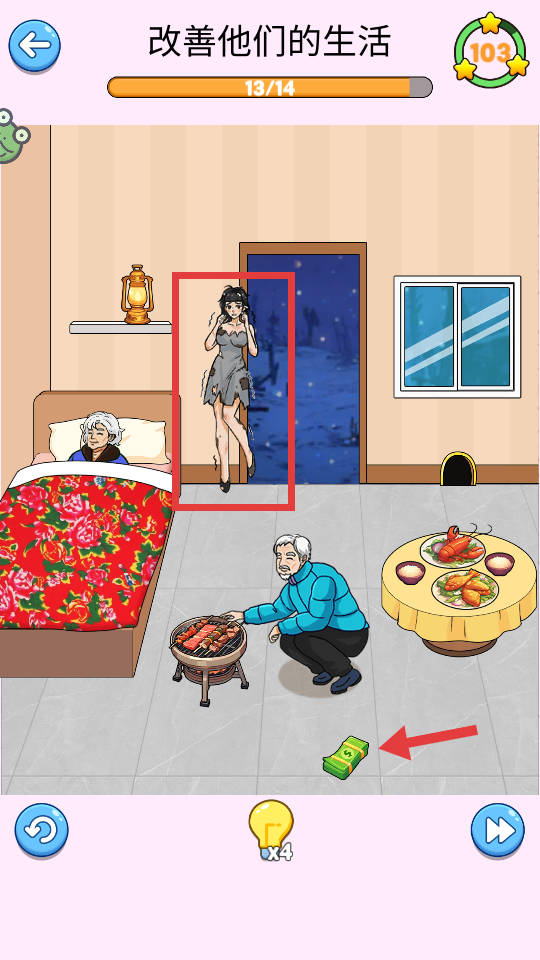 3、打开门后,会出现【孙女角色】,将钞票拖至给她改善即可通关。
