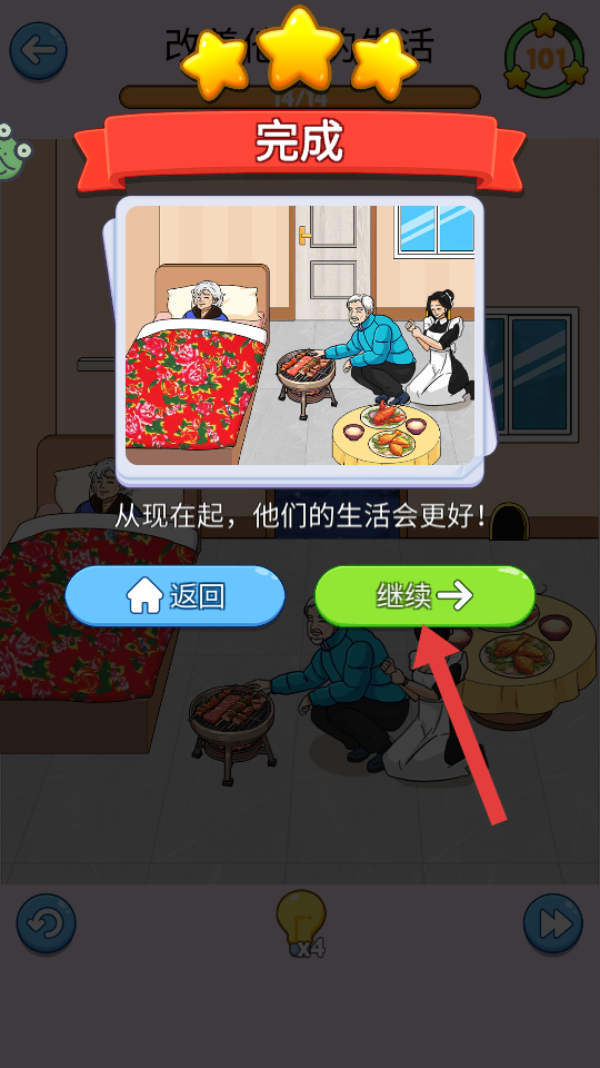 4、当任务进度达到【14/14】,显示【完成】后,点击【继续】按钮,进入下一个关卡。