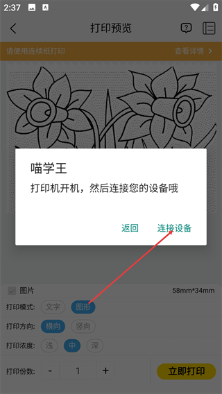 4、若未连接设备,会弹出提示弹窗,点击“连接设备”按钮,完成设备配对,即可进行打印操作。