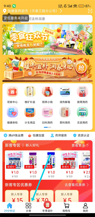 1、打开怡康到家,点击底部【分类】,进入药品分类页面,方便查找药品呢。