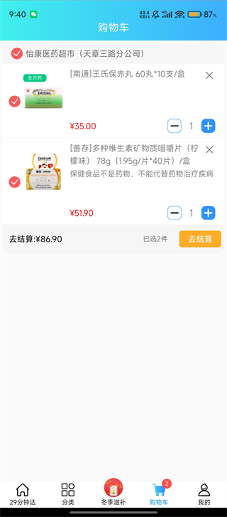 3、选好药品后,点击底部【购物车】,确认选中的药品,然后点击【去结算】,准备完成购药流程啦。