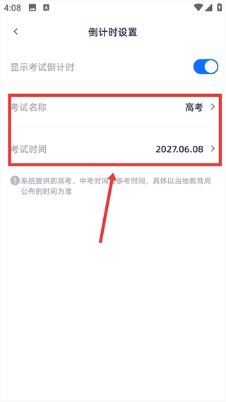 3、在倒计时设置页面,开启【显示考试倒计时】的开关,激活考试倒计时功能。