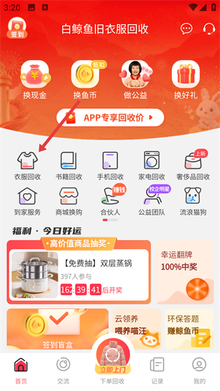 1、我们打开白鲸鱼旧衣服回收app,点击【衣服回收】选项,就能进入预约上门回收的页面啦。