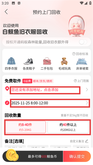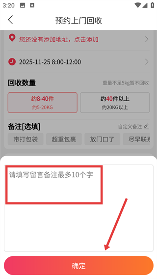 2、在预约上门回收页面,我们添加地址,选择回收时间和回收数量,比如约8-40件,就可以继续操作哦。