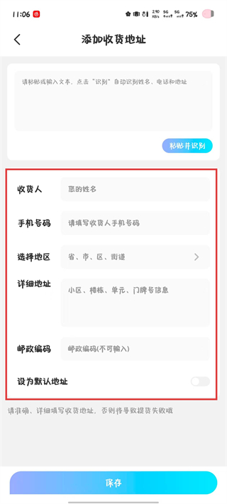 4、依次填写收货人姓名手机号码地区详细地址等信息,点击保存。