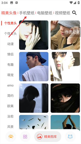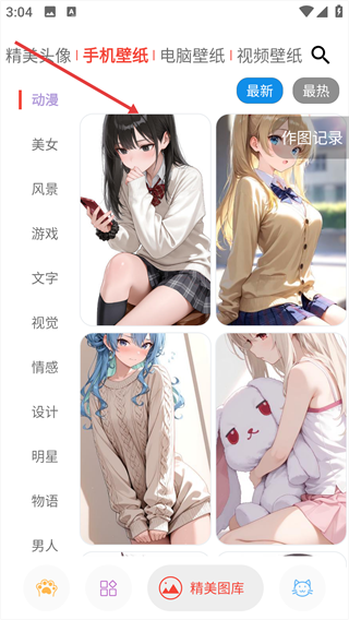 2、在精美图库页面顶部,选择“手机壁纸”分类标签。