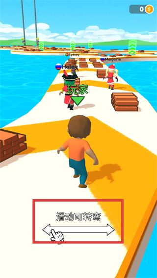 1、按照【滑动可转弯】提示,滑动屏幕控制角色转向,在赛道上躲避其他角色,推进前进。