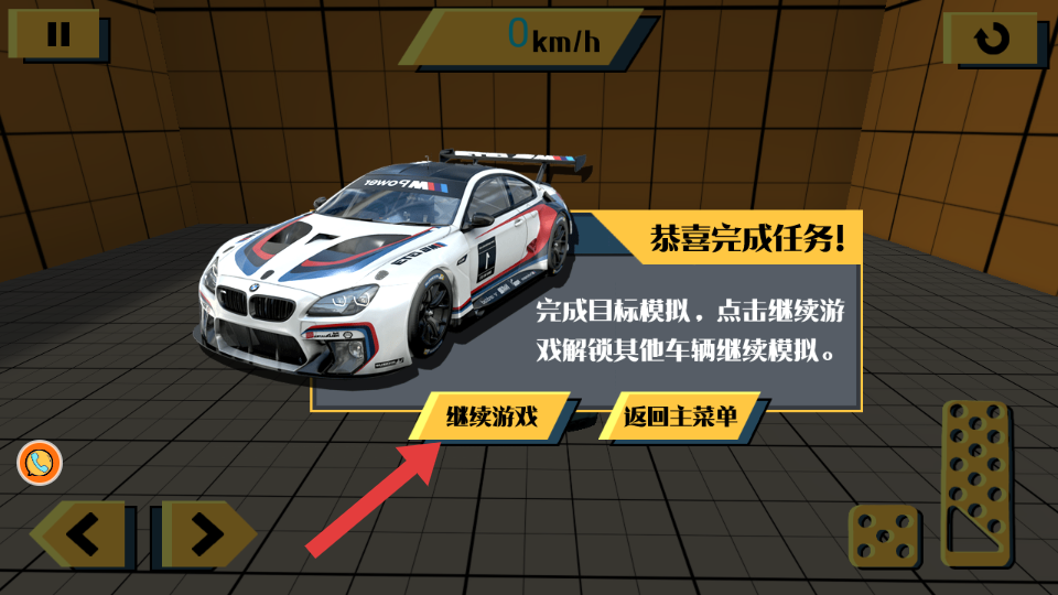 4、到达位置显示【恭喜完成任务】后,点击【继续游戏】按钮,解锁其他车辆并继续进行驾驶模拟。