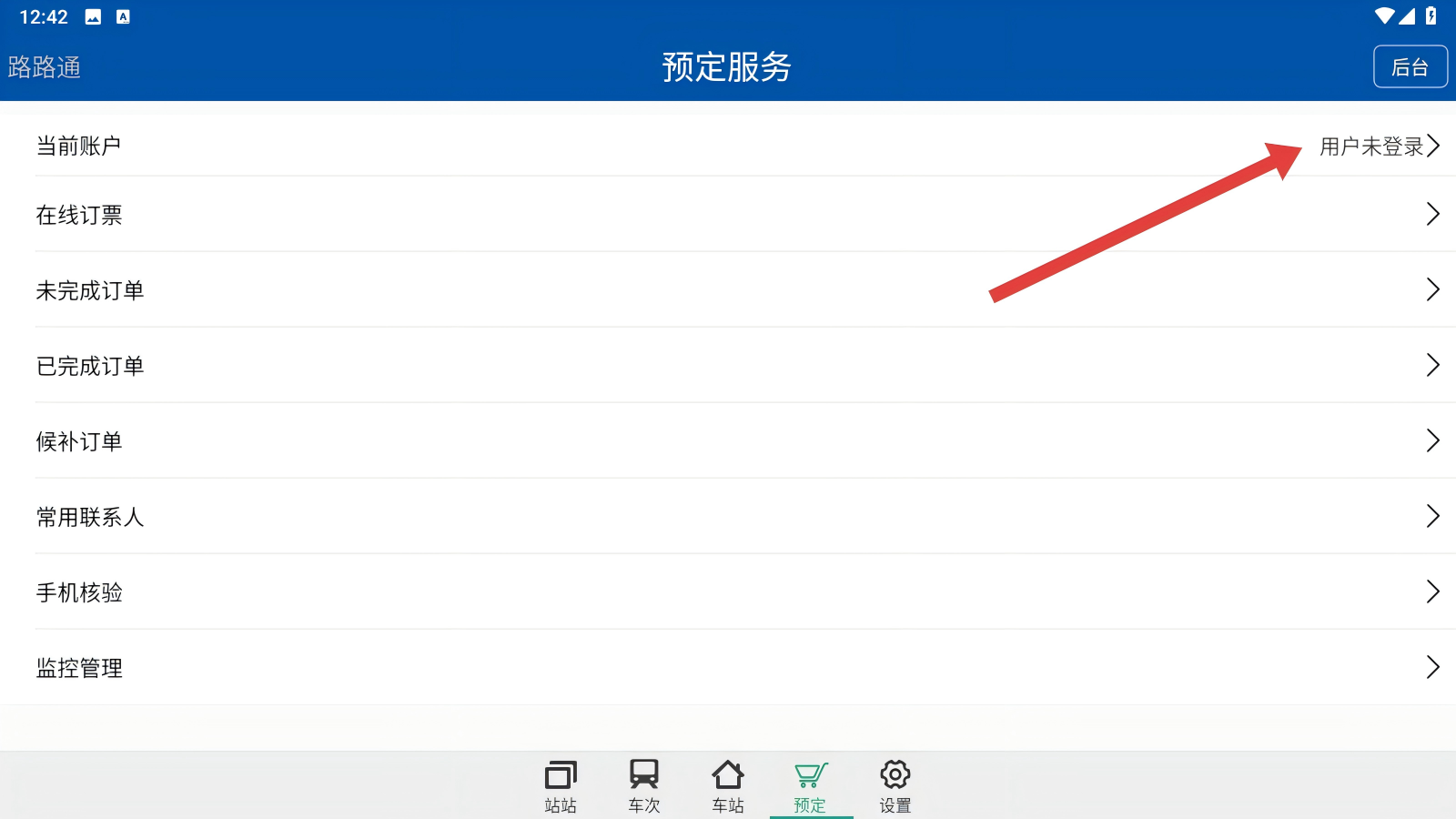 1、打开【路路通】app的【预定】页面,能看到【当前账户-用户未登录】选项,点击它就能进入登录界面啦。